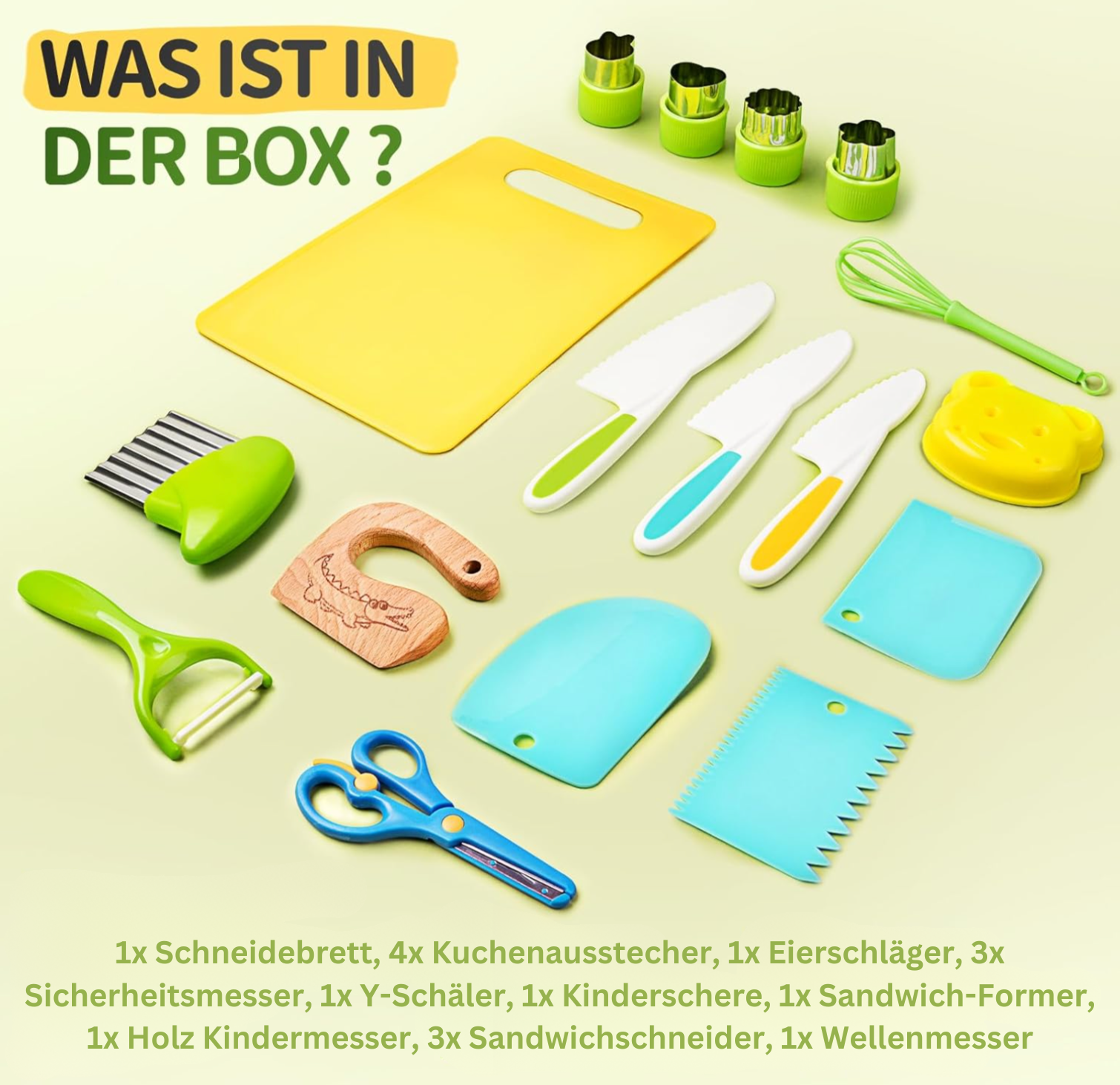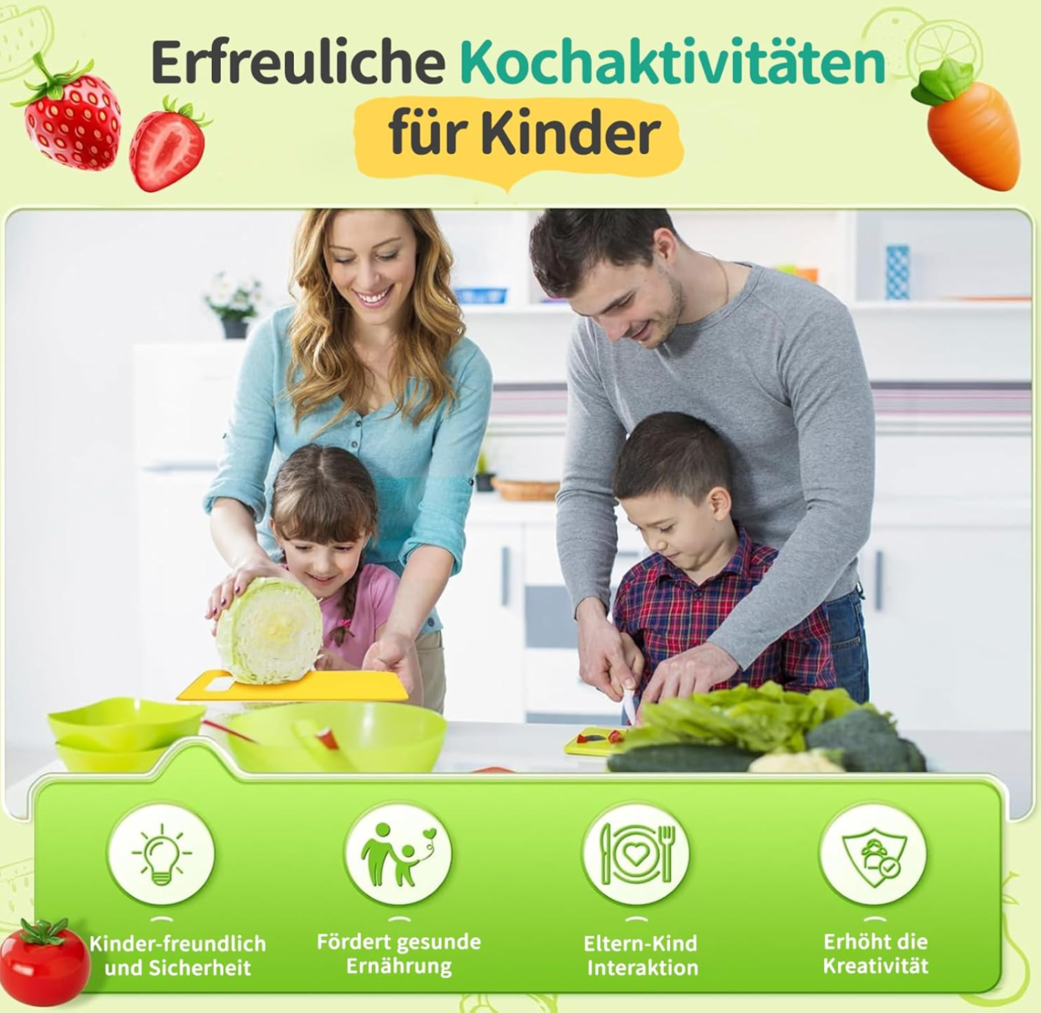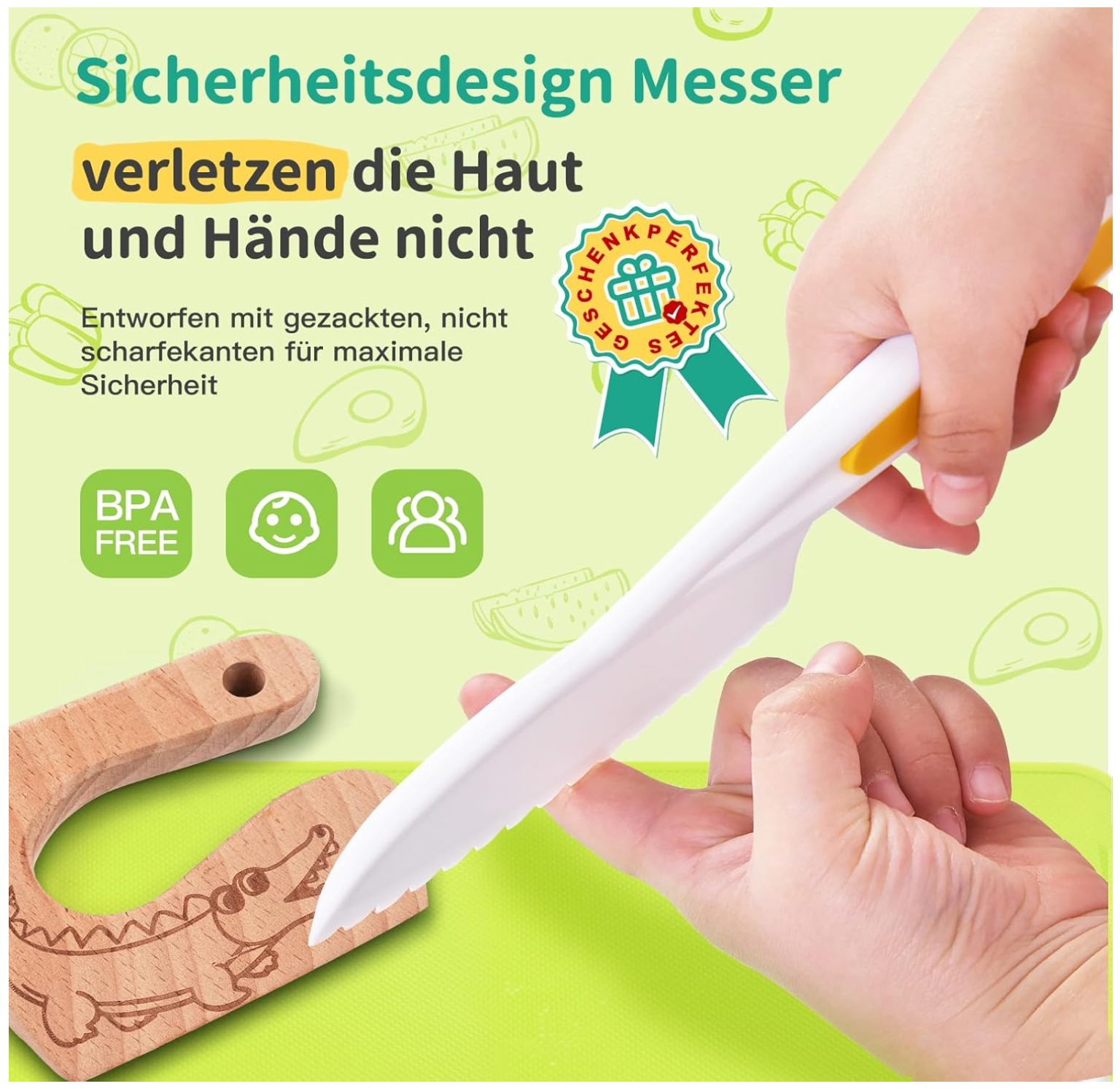 Warum dieses Set? Dieses Set lässt kleine Köche sicher und kreativ in der Küche agieren. Ob beim Zubereiten von Snacks oder beim Backen – mit den kindgerechten Werkzeugen können Kinder mit viel Spaß und wenig Risiko in der Küche aktiv werden. Perfekt für Eltern, die ihre Kinder in einem sicheren Umfeld beim Kochen und Zubereiten von Speisen begleiten möchten.