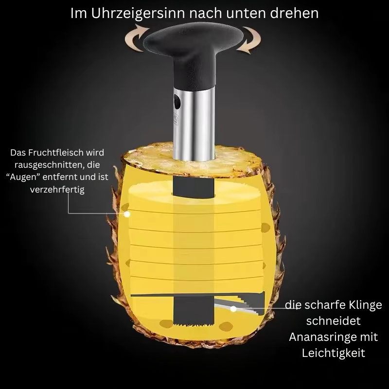 Erlebe die einfachste und schnellste Art, eine frische Ananas zu genießen! Unser hochwertiger Ananasschäler aus Edelstahl entfernt mühelos Schale und Strunk, während er die saftigen Fruchtstücke in perfekte Ringe schneidet